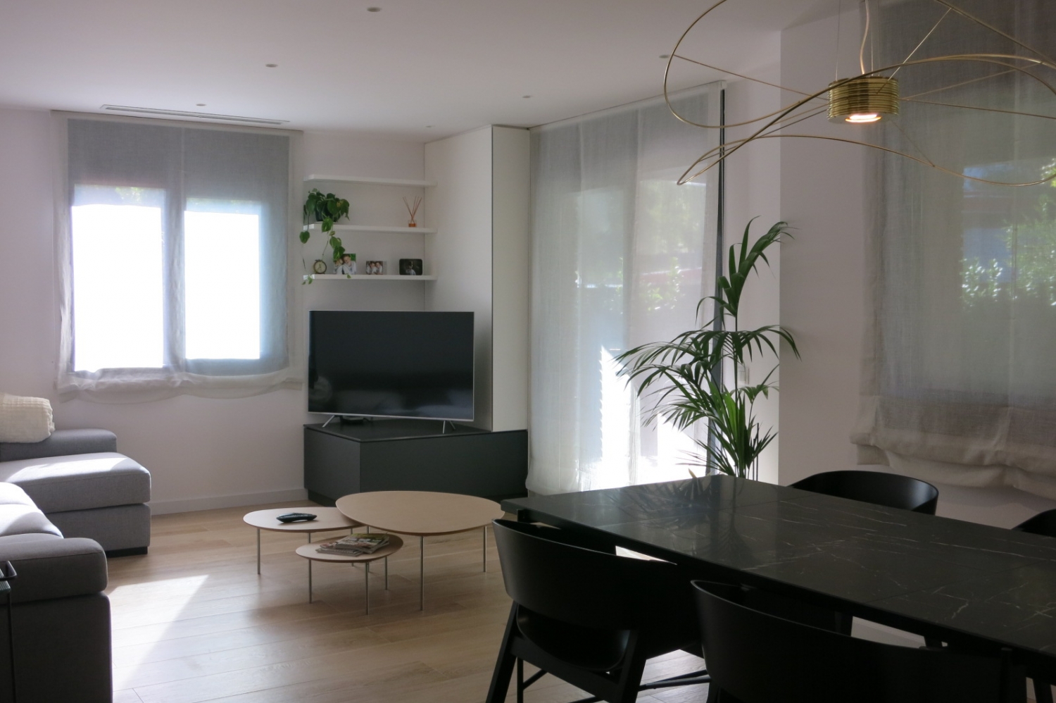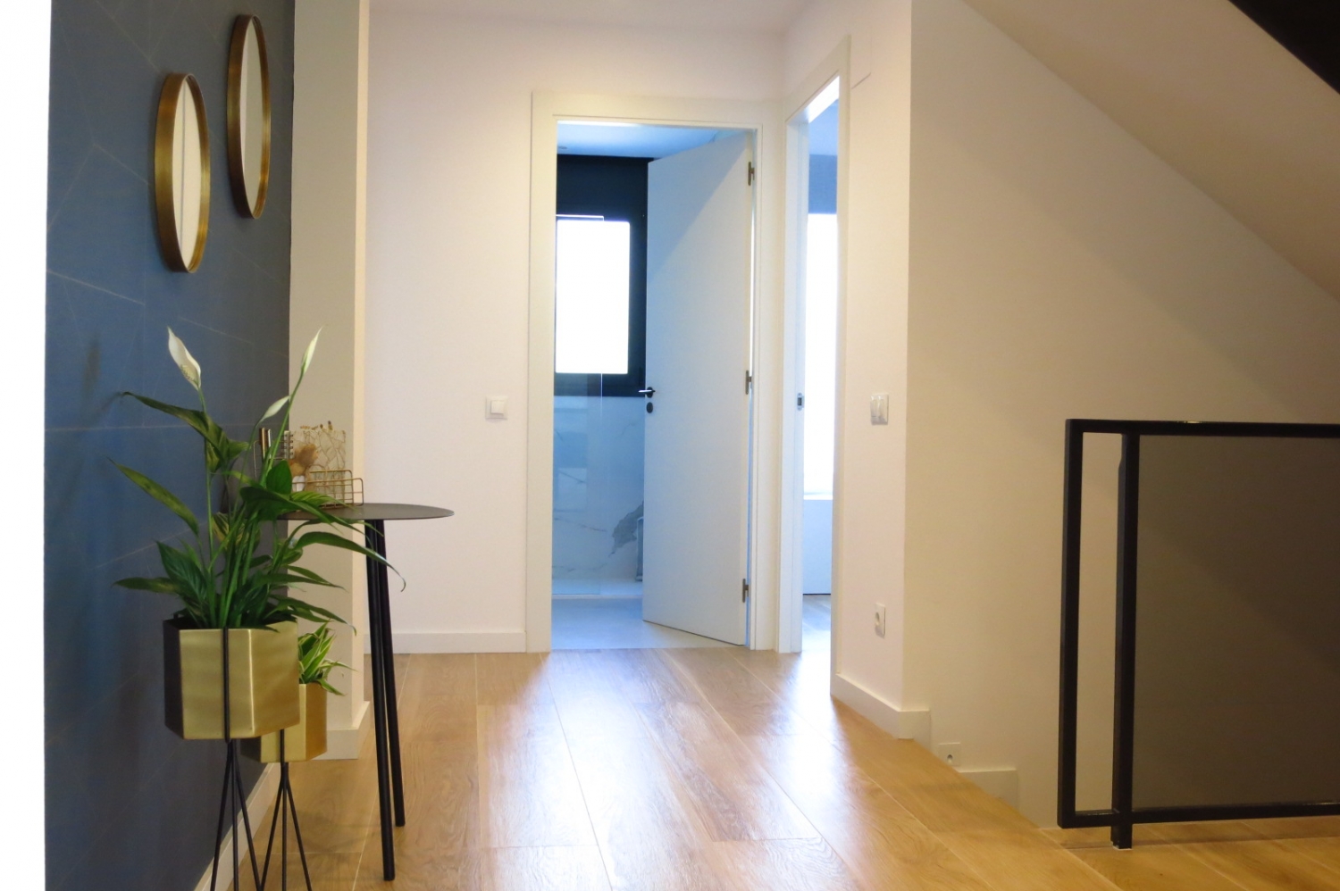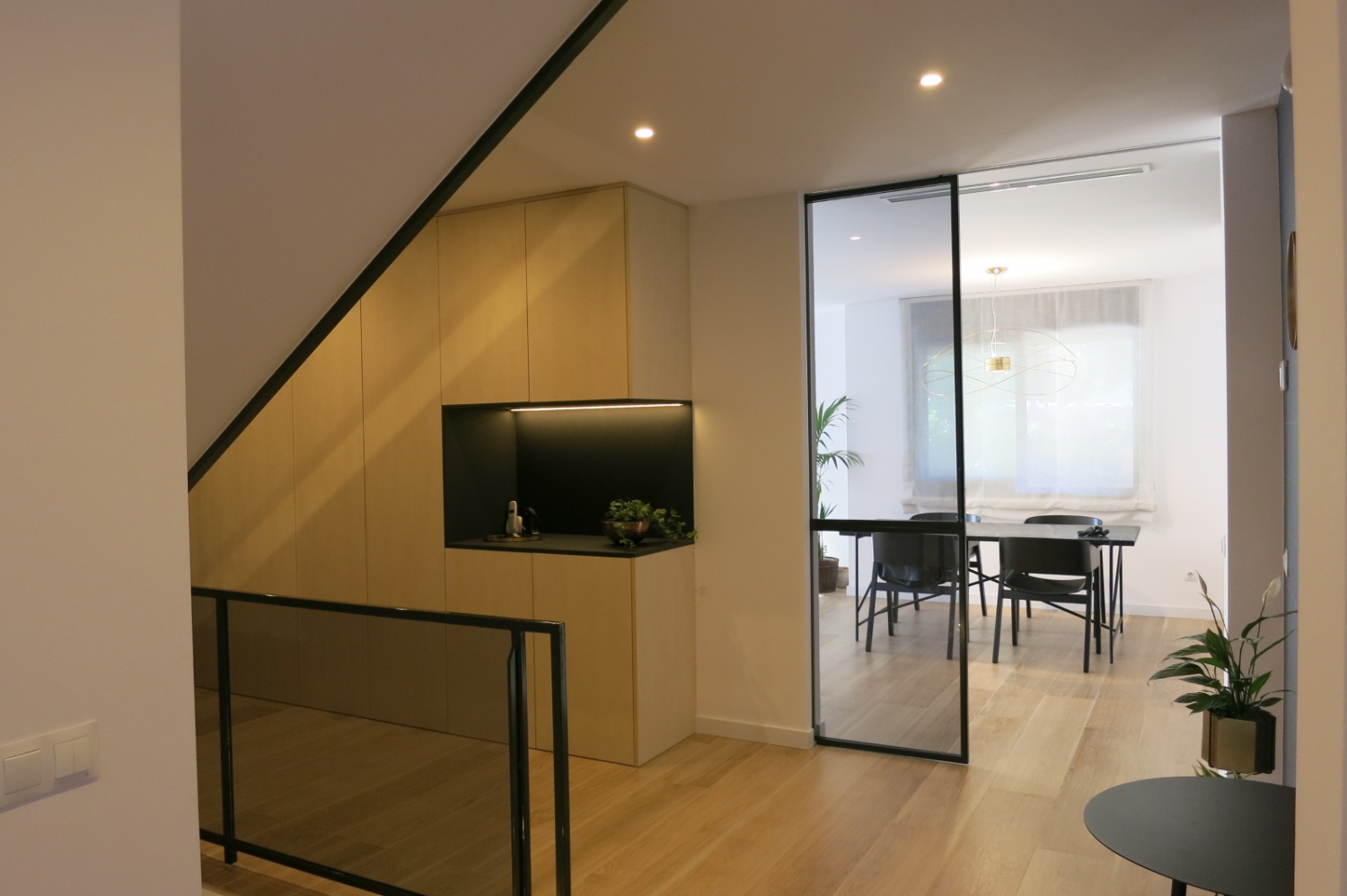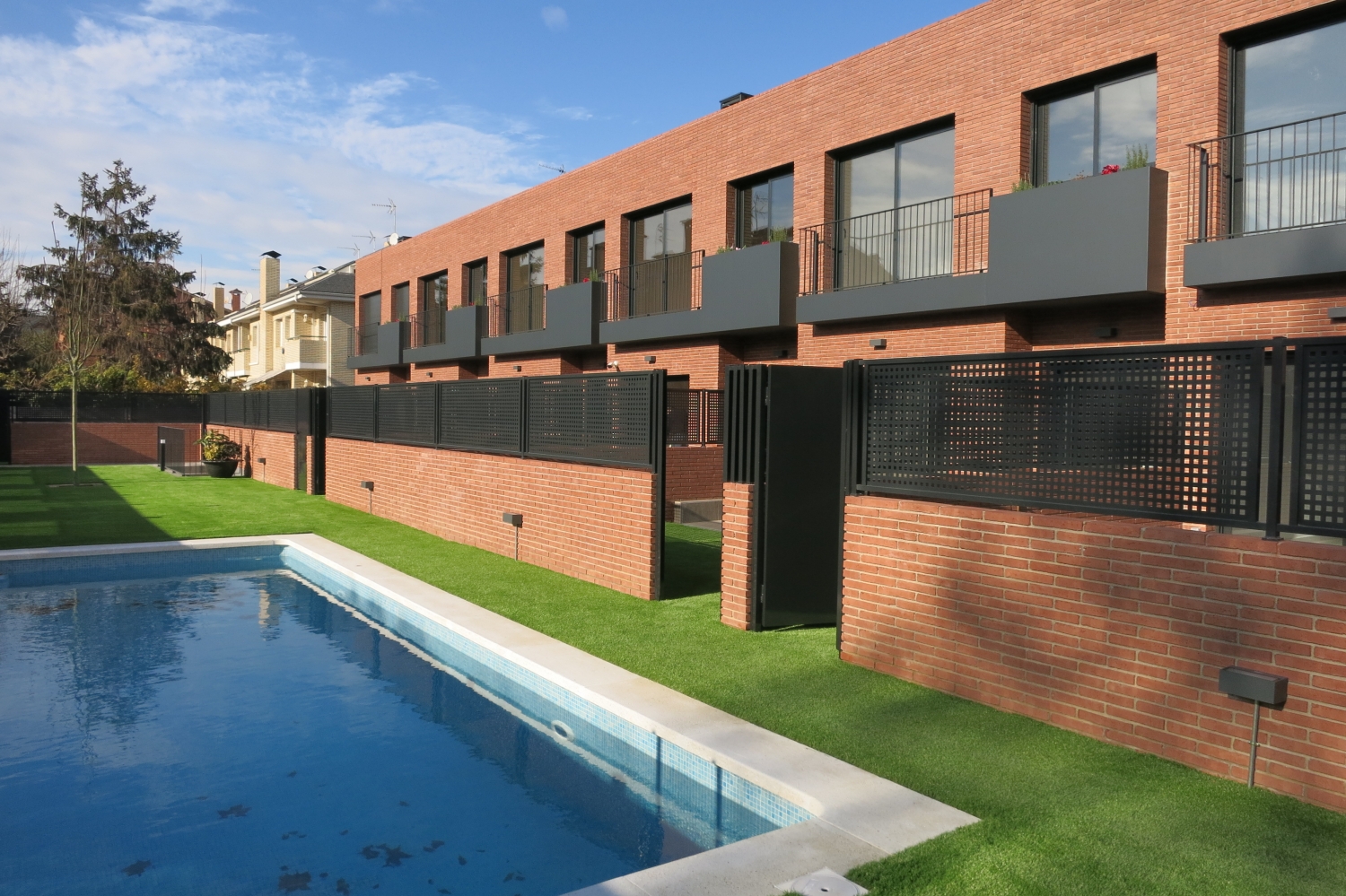Promoción de 7 casas adosadas de tres plantas con garaje, jardÃn y piscina comunitaria. No hay dos casas iguales, puesto que los propietarios han elegido la distribución, los materiales de cocina y baños y los acabados en general.
